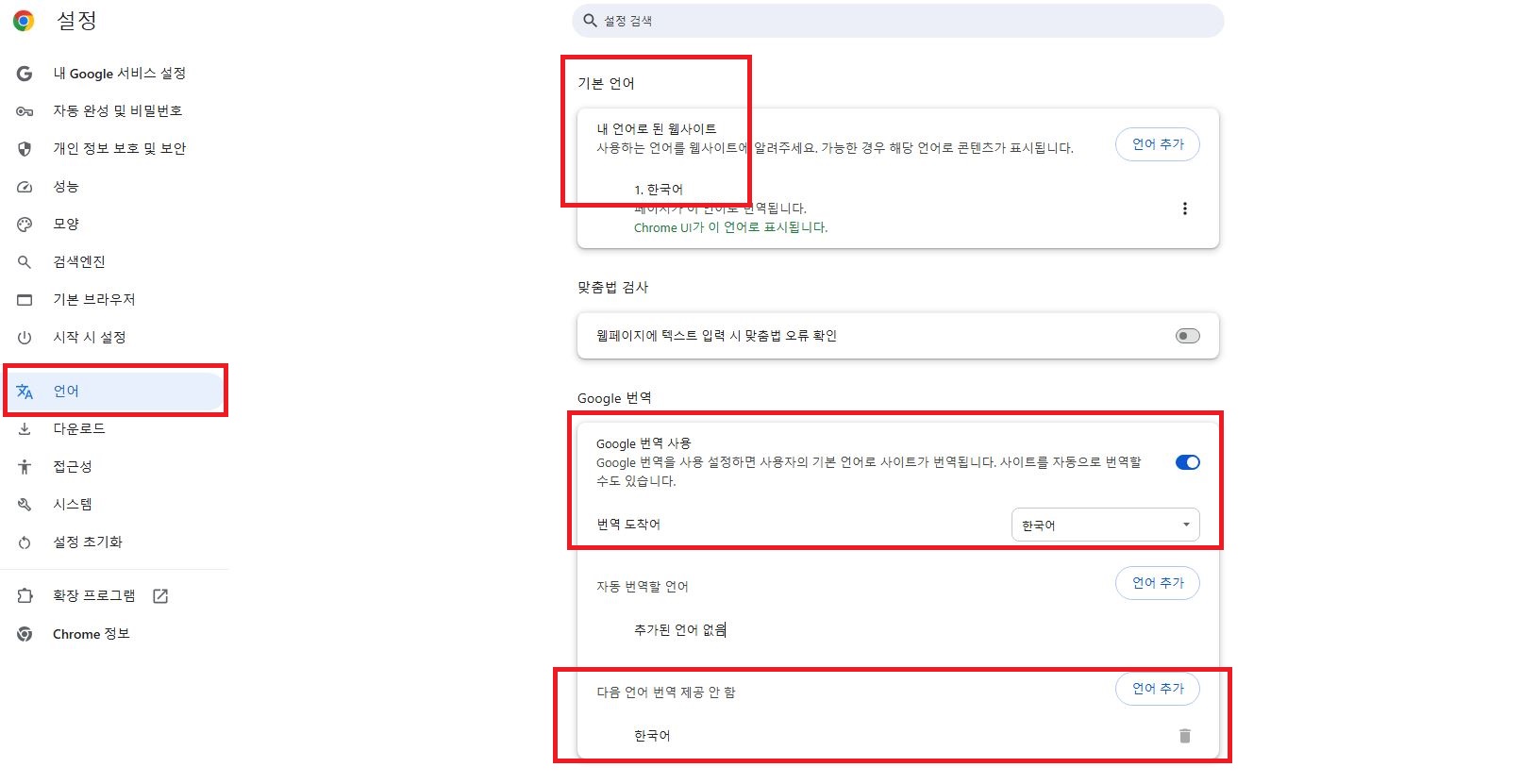 (3) google 번역 사용 가능에서 파란색으로 체크를 하여 활성화하고, 번역 도착어는 한국어로 해야 합니다.