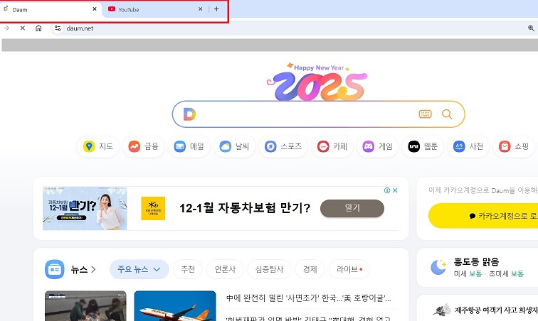 만약, 다음과 유튜브 2개 사이트를 추가했다면, 크롬브라우저를 열었을 때, 상단에 다음과 유튜브 사이트 2개의 탭이 같이 열리게 됩니다.