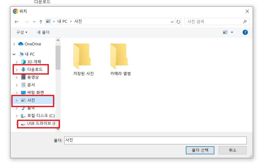 컴퓨터에 저장하고 싶지 않다면 "USB 드라이브"를 선택해도 되고, USB 안의 특정 폴더를 만들어서 그 폴더로 자동 저장이 되게 해도 됩니다.