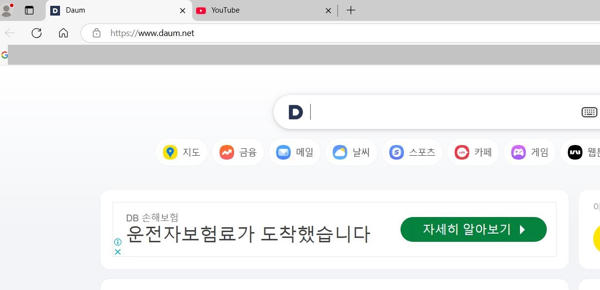 다음도 추가하고, 유튜브도 추가한 다음 엣지 브라우저 아이콘을 눌러서 최초로 브라우저를 실행하면, 아래의 사진처럼 다음과 유튜브 두 개의 탭이 동시에 생성되어 얼리는 것을 확인할 수 있습니다.