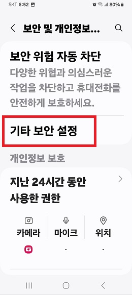 3. 여러 항목들 중 <기타보안설정>에 들어갑니다.