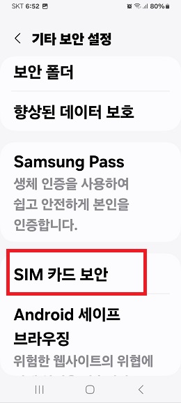 4. 기타 보안 설정의 여러 항목중 <SIM카드 보안>을 찾아 들어갑니다.