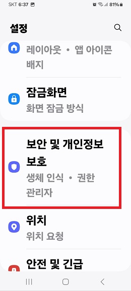 2. 설정 안의 여러 가지 항목들 중 내려가다 보면 나오는 <보안 및 개인정보 보호>에 들어갑니다.
